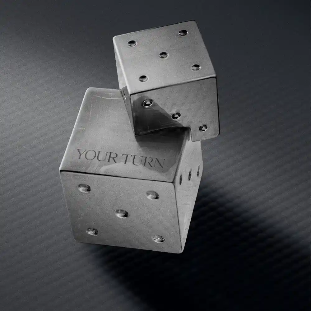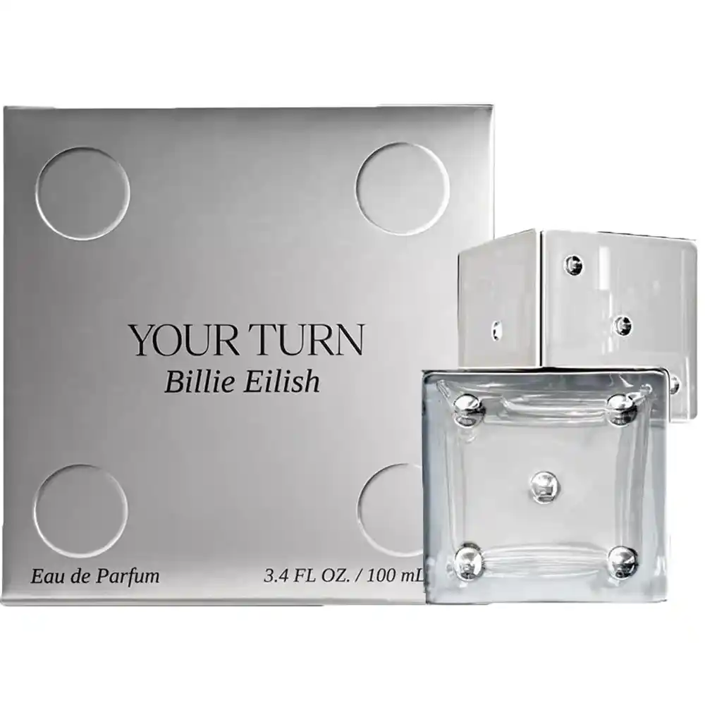 The bottle design is bold and artistic, inspired by sculptural metal dice with an industrial matte finish. Its geometric form and studded details reflect risk, chance, and self-expression, while the engraved “YOUR TURN” adds a powerful statement of confidence. The design feels collectible, modern, and unmistakably Billie Eilish.