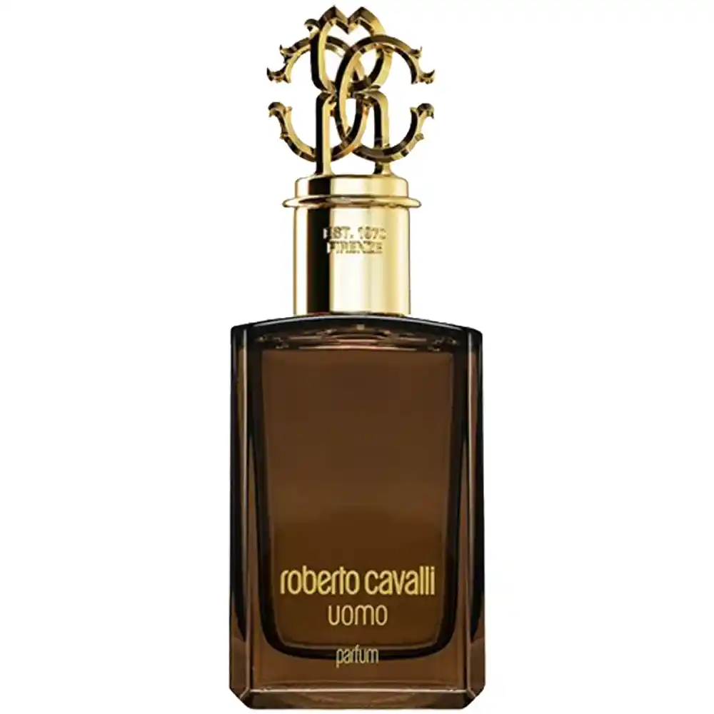The bottle of Roberto Cavalli Uomo Parfum reflects bold sophistication and Italian glamour. Its deep amber glass conveys warmth and intensity, while the ornate golden cap crowned with the Cavalli monogram adds a striking touch of luxury. This elegant design makes it a standout piece on any fragrance collection.